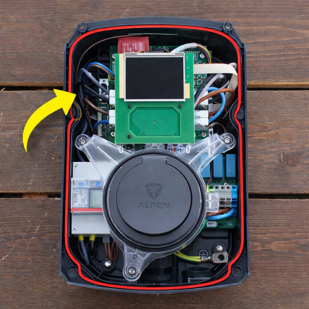 Deze rubberen afdekring wordt gebruikt in Single laadstations van Alfen. Deze rubberen ring zit in de behuizing van het laadstation en zorgt ervoor dat het laadstation waterdicht is. Zie de afbeeldingen waar deze rong precies zit.