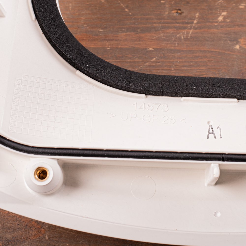 Op de foto staat een complete witte lader afgebeeld. Het front wordt geleverd zonder outlet of een klep voor de outlet. Het front heeft een uitsparing voor de outlet die in de lader zelf is ingebouwd.