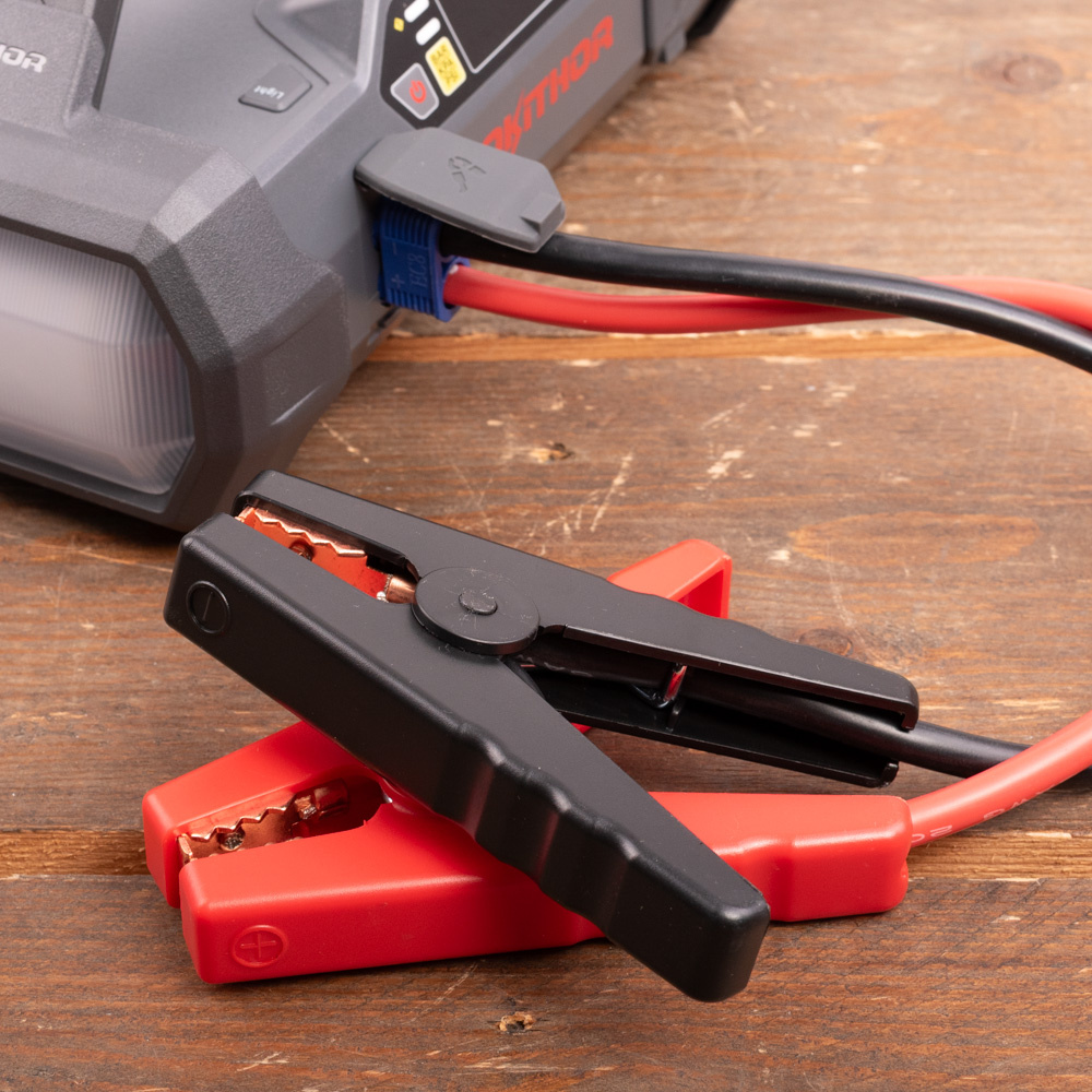 De startboosters van Lokithor zijn altijd uitgerust met hoogwaardige accuklemmen/ krokodillenklemmen die robuust gebouwd zijn en die een laag weerstandsniveau hebben. De kabellengte tussen uw startbooster en de accuklemmen is ongeveer 20cm.
