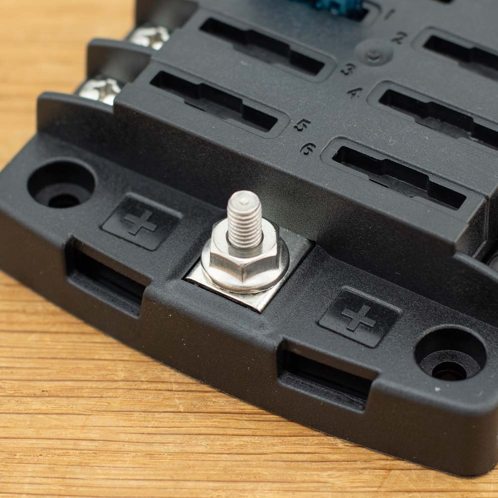 U kunt de zekering distributie vastschroeven via 4 schroefgaten in de behuizing. De schroeven worden niet meegeleverd bij dit product. De aansluitingen van het circuit (de afzonderlijke apparaten) zitten aan de zijkant van de distributie en kunnen met M4 aansluitingen/ boutjes. De input aansluiting is M5, aan te sluiten met een M6 perskabeloog.
