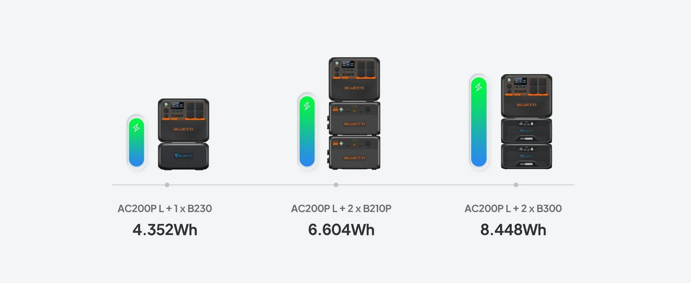 De AC200PL is compatibel met B210P-, B230- en B300-accu's. U kunt daarmee de capaciteit aanpassen tot maar liefst 8448Wh!