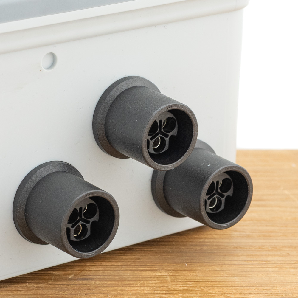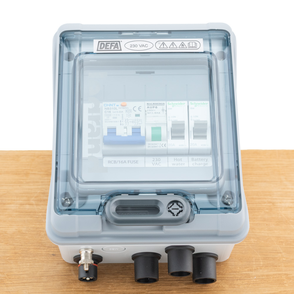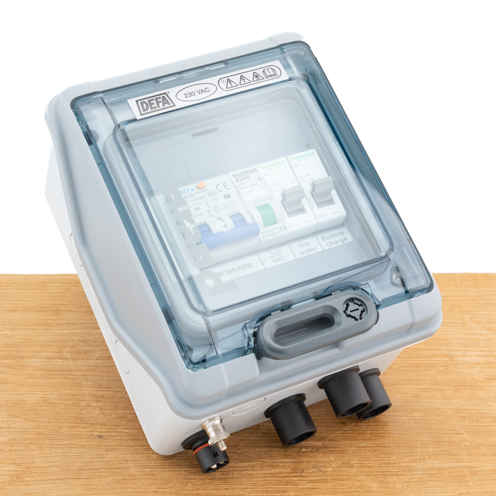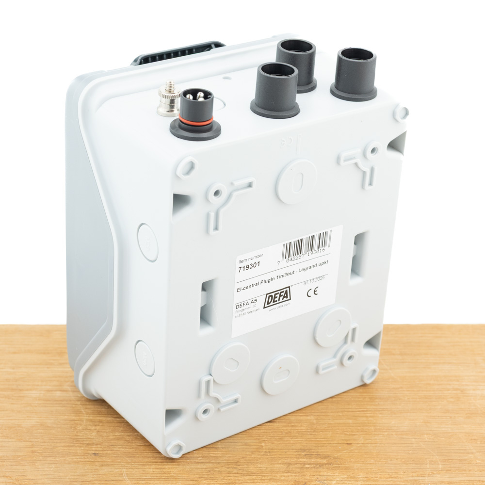 De el-central heeft 1 DEFA PlugIn mannelijke ingang en 3 PlugIn vrouwelijke uitgangen. De ingang is aangesloten via een 16A aardlekschakelaar. Een van de uitgangen levert constante spanning, terwijl de andere twee via een schakelaar zijn aangesloten. Alle connectoren bevinden zich aan één zijde van de behuizing. Het aardcontact is verbonden met een kathodebeveiligde diodebrug, die corrosie vermindert bij aansluiting op walstroom.