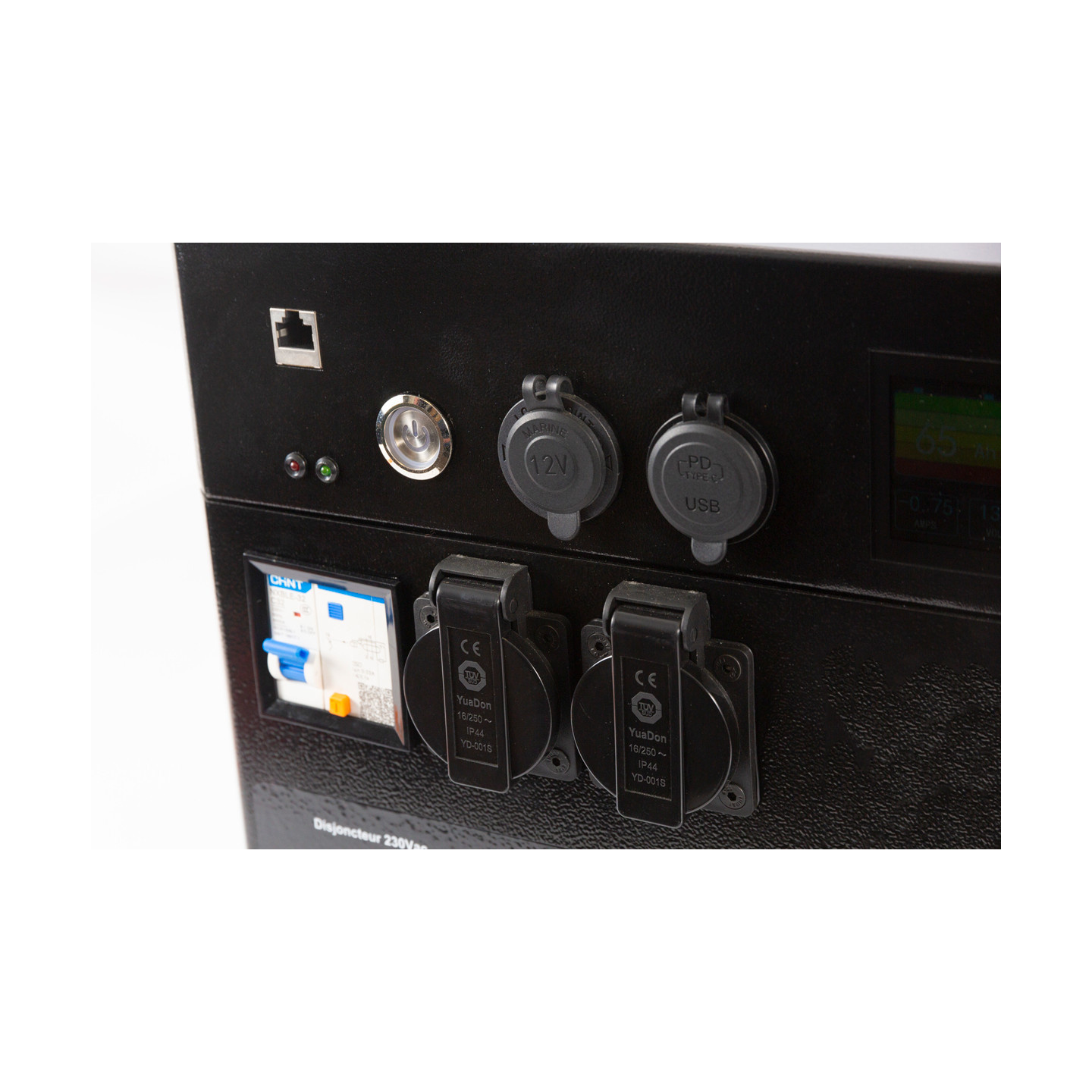 De geïntegreerde, krachtige zuivere sinusomvormer van deze Powerbox heeft een capaciteit van 3000W. De lithium (LiFePO4) accu van het exemplaar op deze pagina is 120Ah / 1536Wh.