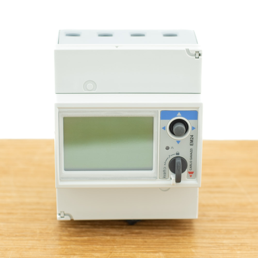De Victron EM24 energiemeter is een type EM24 DIN driefase-energiemeter. Deze energiemeter is geschikt voor maximaal 65A per fase en is gemakkelijk te bedienen met een joystick aan de voorzijde van het apparaat en LCD-gegevensweergave.