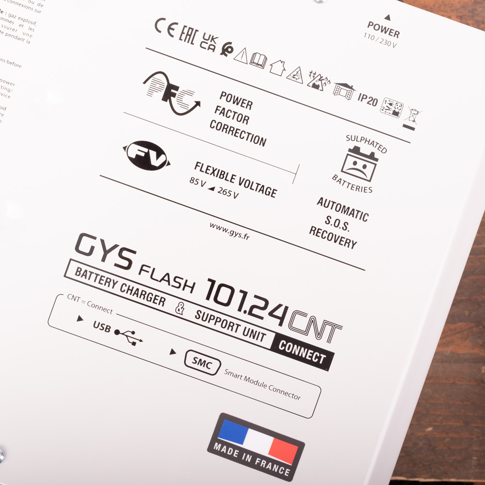 De GYSFLASH 101.24 CNT FV - waarbij CNT staat voor Connected en FV voor Flexibel Voltage - is een krachtige, veelzijdige max. 100A acculader (1500W bij 6/12V en max. 3200W bij 24V accu's) met Inverter technologie. Het is een acculader voor 6V, 12V en 24V loodaccu's (vloeibaar/AGM/Gel) en Lithium (Lithium-ion en LiFePO4) accu's van 5-1200Ah.