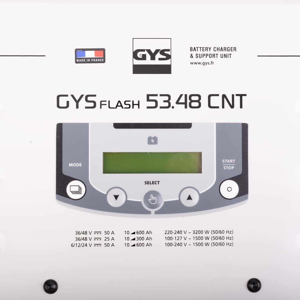 De GYSFLASH 53.48 CNT FV - waarbij CNT staat voor Connected en FV voor Flexibel Voltage - is een krachtige, veelzijdige max. 100A acculader (1500W bij 6/12 en 24V en max. 3200W bij 36 en 48V accu's) met Inverter technologie. Het is een acculader voor 6V, 12V, 24V, 36V en 48V loodaccu's (vloeibaar/AGM/Gel) en Lithium (Lithium-ion en LiFePO4) accu's van 5-600Ah.