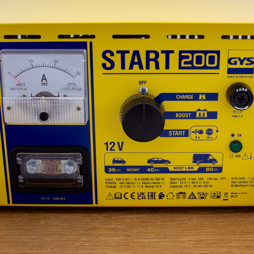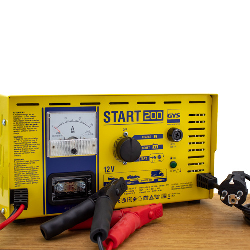 De GYS Start 200 Start is een lader en starthulp voor natte 12V loodzuur accu’s van 53 tot 240Ah. De Start 200 is een startbooster met startvermogen van 80A, geschikt voor voertuigen met een accu van 35 tot 80Ah. De Start 200 is ook prima geschikt om sterk ontladen accu's op te laden.
