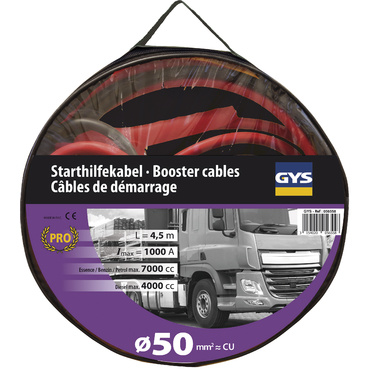 De 'Jump Leads 1000A 7L/4L' van GYS zijn 4,5 meter lange startkabels met koperen kabeldikte van 50 millimeter, voor 7000 cc benzinevoertuigen en 4000 cc dieselvoertuigen. Daarmee geschikt voor o.a. grotere auto's en vrachtwagens. Deze boost cables hebben geïsoleerde accuklemmen.