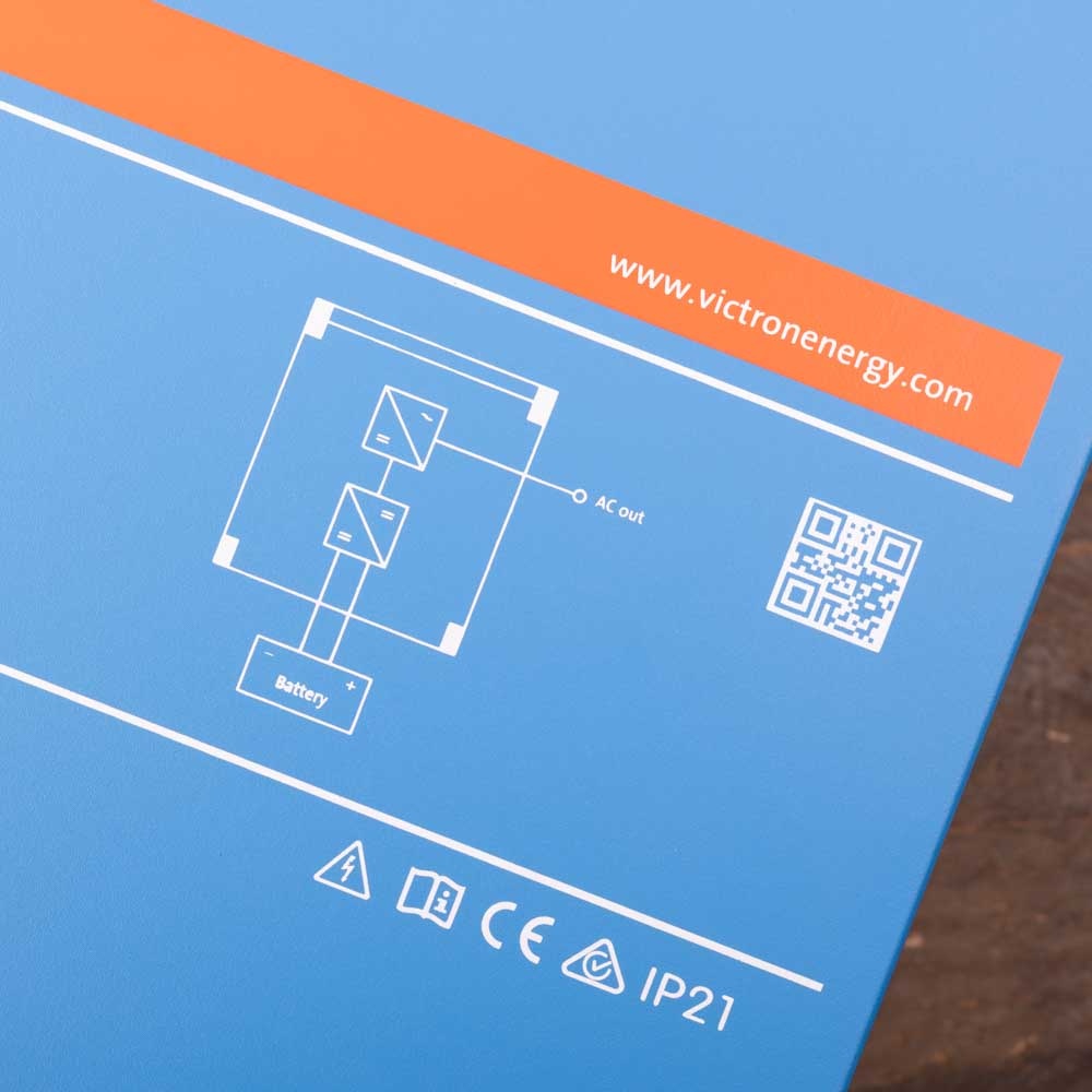 Op het compacte beeldscherm kunt u enkele details tijdens de werking van de inverter aflezen. Dezelfde informatie kan met een smartphone of een ander toestel met Bluetooth via de app bekeken worden. Via Bluetooth kan verder via de VictronConnect app de configuratie van de inverter beheerd worden.
