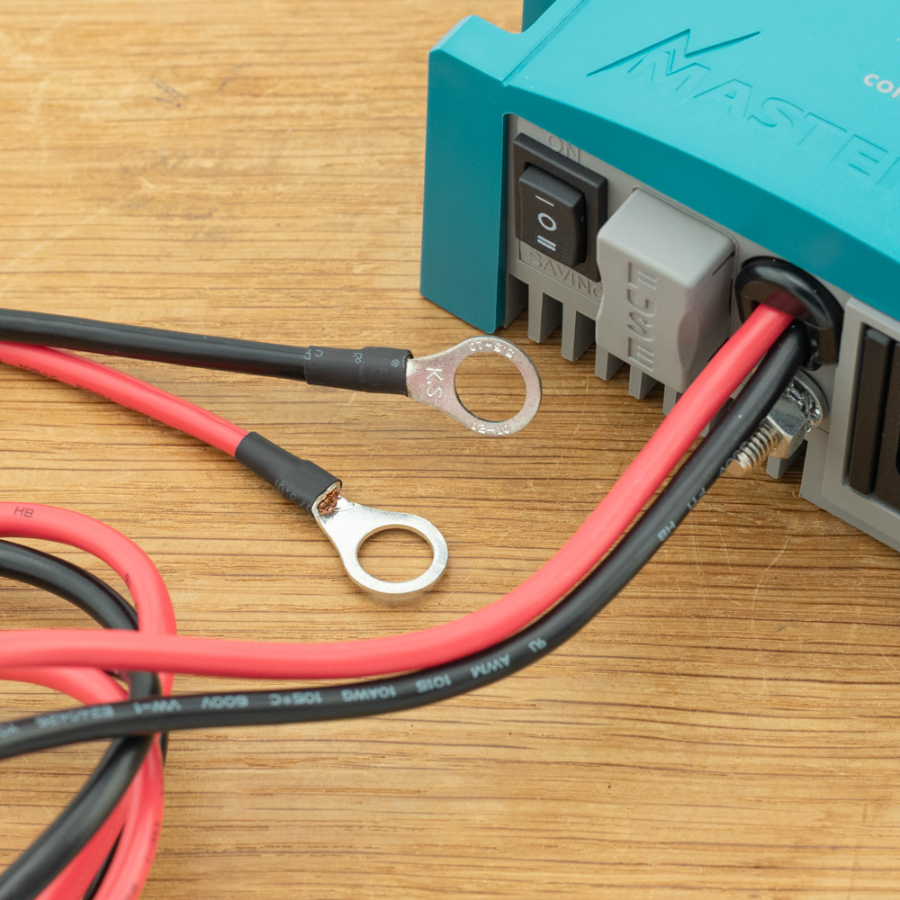 De AC Master wordt geleverd met een 3 pins C13 stekker waaraan een netsnoer (niet meegeleverd) gemonteerd kan worden t.b.v. de aansluiting van 230V apparatuur. Aan de AC Master 24/300 zijn 1,5 meter lange accukabels gemonteerd met eyelets t.b.v. de aansluiting op de accupolen.