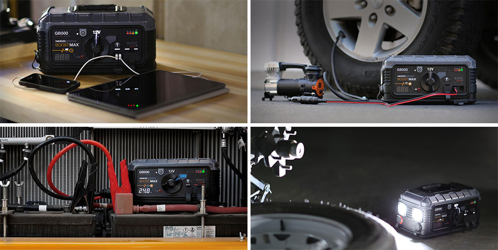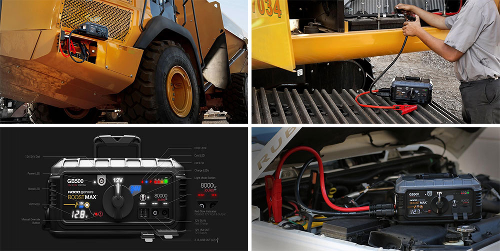 De Noco Genius GB500 Boost Pro Jumpstarter 6.250A is een professionele en zeer krachtige starthulp. U kunt auto's en vrachtauto's probleemloos starten. De GB500 een lithium-ion startbooster voor 12V en 24V systemen. De Genius GB500 is verder een powerbank waarmee u vele apparaten kunt opladen van telefoons, iPads tot fototoestellen en laptops. Met de 12V output heeft u zelfs stroomtoevoer voor 12V apparaten (tot 15A). De startboost functie voor 12V systemen is maar liefst 6.250A en voor 24V systemen 3.725A geschikt voor het starten van zware motoren en zwaar materieel. Deze versie van de Noco GB500 heeft startkabels van 1,8 meter lang.