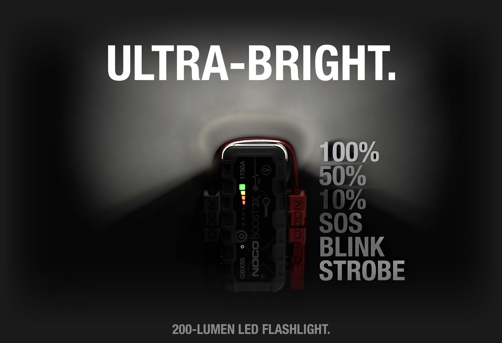Aan één zijde (aan de output zijde) van de GBX55 zijn 2 krachtige witte LED lichten aanwezig die in 7 verschillende modi kunnen branden of knipperen. Ze kunnen gebruikt worden om in het donker bij te schijnen onder de motorkap of bij de accu. Ze kunnen ook gebruikt worden als SOS licht of noodsignaal verlichting. Deze LED verlichting kan ook gewoon gebruikt worden als krachtige zaklamp. Een krachtige zaklamp bij u hebben kan altijd van pas komen.