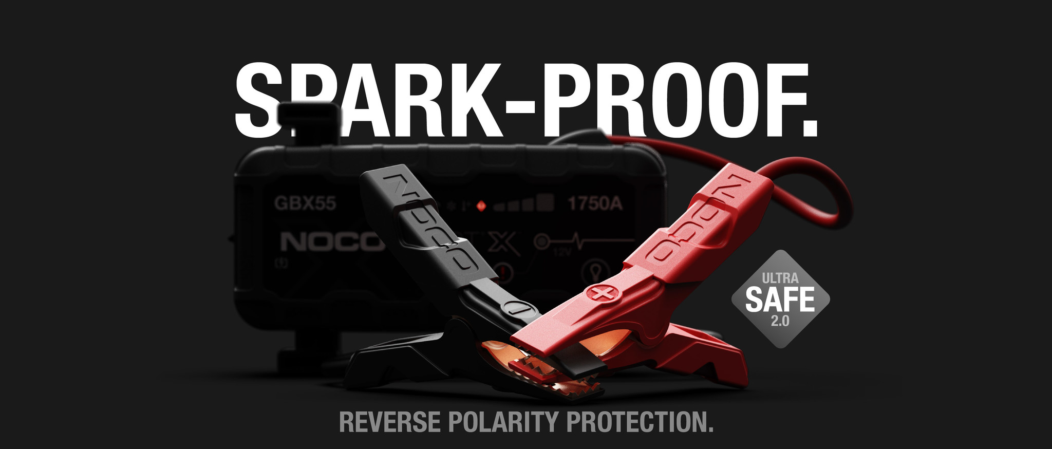 De GBX55 van Genius is beveiligd tegen verkeerd aansluiten van de accuklemmen (omgekeerde polariteit of ompoling) en oververhitting. Verder zal de GBX55 niet automatisch een voertuig starten als het voltage van de accu 2V of lager is. De boost-led gaat dan niet branden en u dient over te schakelen naar de handmatige startboost mode. Dit is een belangrijke ingebouwde veiligheid zodat niet een startboost gegeven wordt als de booster niet aangesloten is aan een accu of als u dat niet wilt.