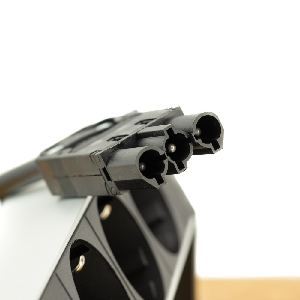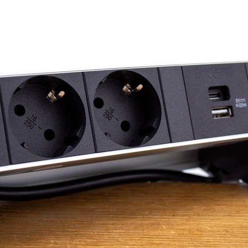 Aan de basis van dit kabelmanagementsysteem voor Schuko (en deels ook met USB, zoals het geval is bij dit product, in de vorm van twee USB-A 4.2A outlets) liggen compacte, aangespoten 3-polige connectoren. Deze hebben een male en female zijde, voor modulaire opbouw- en aansluitmogelijkheden. De kwaliteit komt terug in de sterke trek- en buigontlasting.