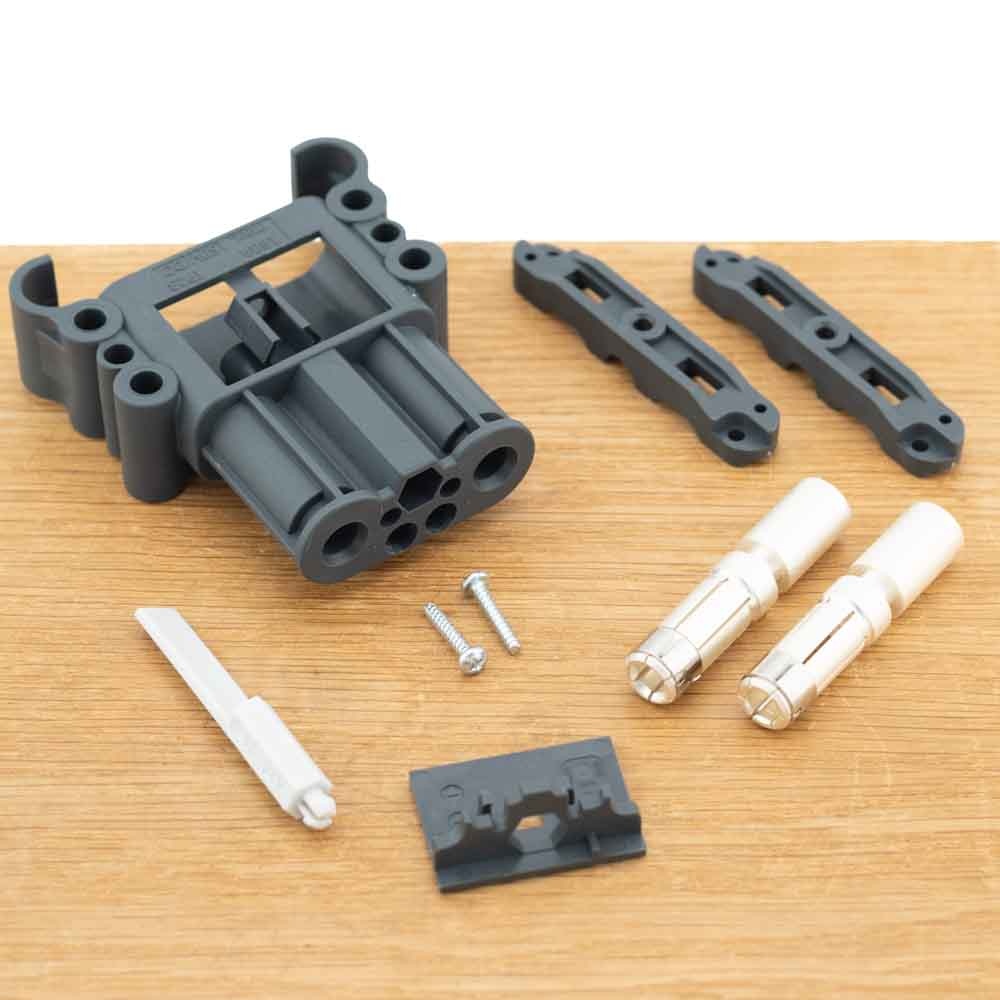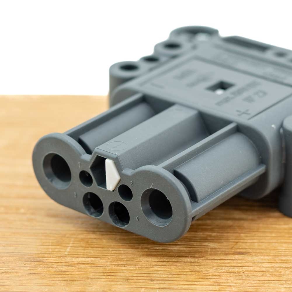 De montage van de contacten kan m.b.v. een perskabeltang of door de laskabels/ accukabels te solderen.