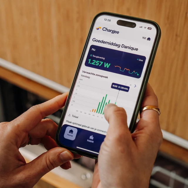 Alle energiegegevens zijn direct zichtbaar in de Chargee app, zodat je gedetailleerd inzicht hebt in je energieverbruik en productie. Met deze gebruiksvriendelijke oplossing houd je continu grip op je energiehuishouding, ideaal voor iedereen die bewust wil omgaan met energie en kosten wil besparen.