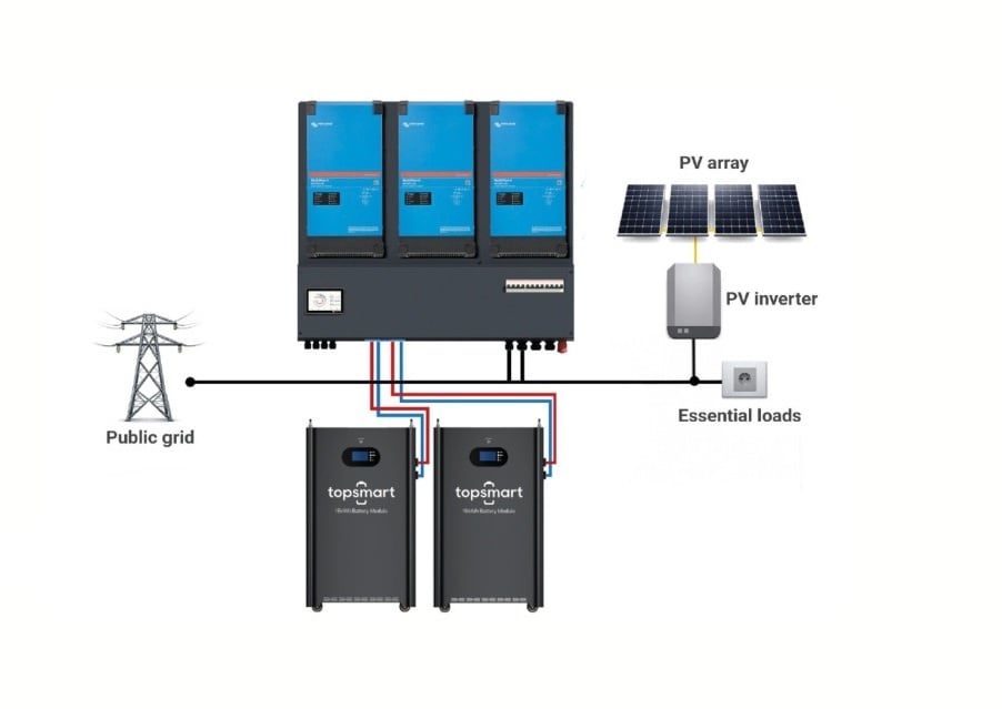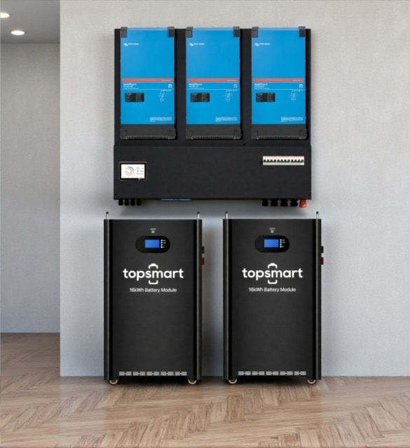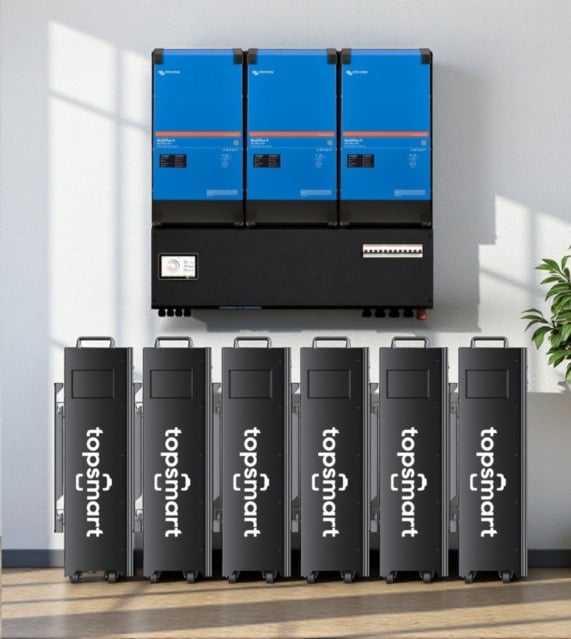Los van de precieze thuisbatterijopstelling-op-maat, bestaat het TopSmart systeem uit Victron Multiplus-II omvormer/lader(s), LV-hub met back plate, inclusief AC- en DC-bus distributie en met Top Systems LiFePO4 accu(’s). De accucapaciteit is modulair uit te breiden.