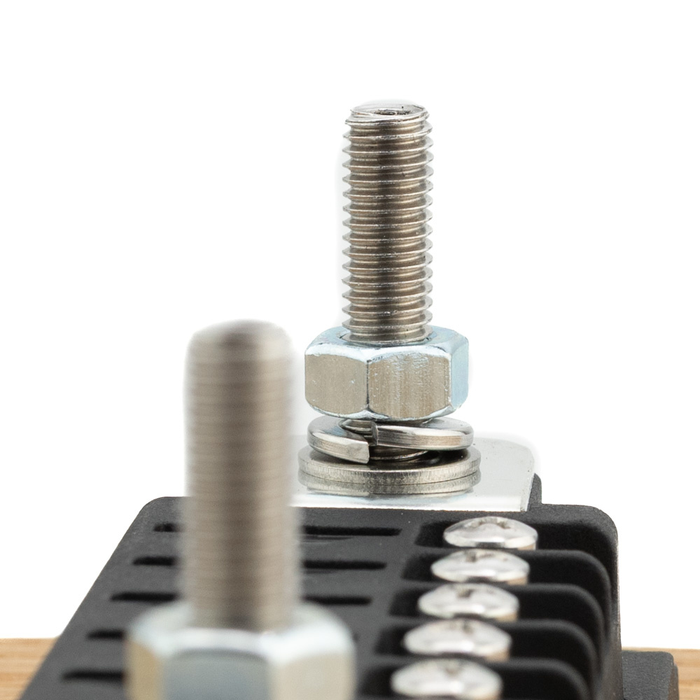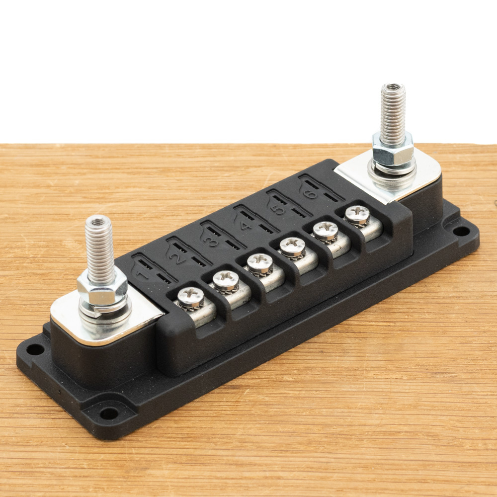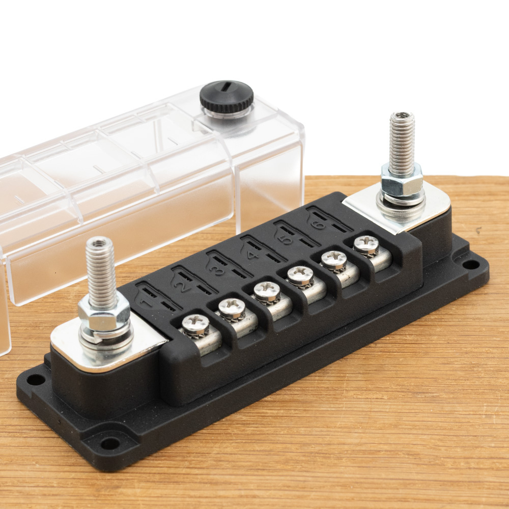 Deze zekeringdistributie biedt 6 keer een steekzekering/ ATO van maximaal 60V en 30A in uw gelijkstroominstallatie. De zekeringdistributie is uitgevoerd met 6 M4 en 2 M8 bouten en een afschroefbare afdekkap. De afdekkap bestaat uit afbreekbare kabeldoorvoeren zodat u nette aansluitingen kunt maken.