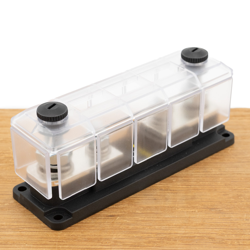 De zekeringhouder bestaat uit roestvrijstalen tapeinden, moeren en ringen voor optimale corrosiebestendigheid. De bussen van vertind hoogzuiver koper zorgen voor maximale geleidbaarheid, verminderen de hitte en verbeteren de efficiëntie. Het vezelversterkt basismateriaal biedt uitstekende eigenschappen bij hoge temperaturen, goede chemische bestendigheid en hoge sterkte. De houder heeft een robuuste transparante deksel met uitbreekopeningen om draadtoegang vanuit elke richting mogelijk te maken.