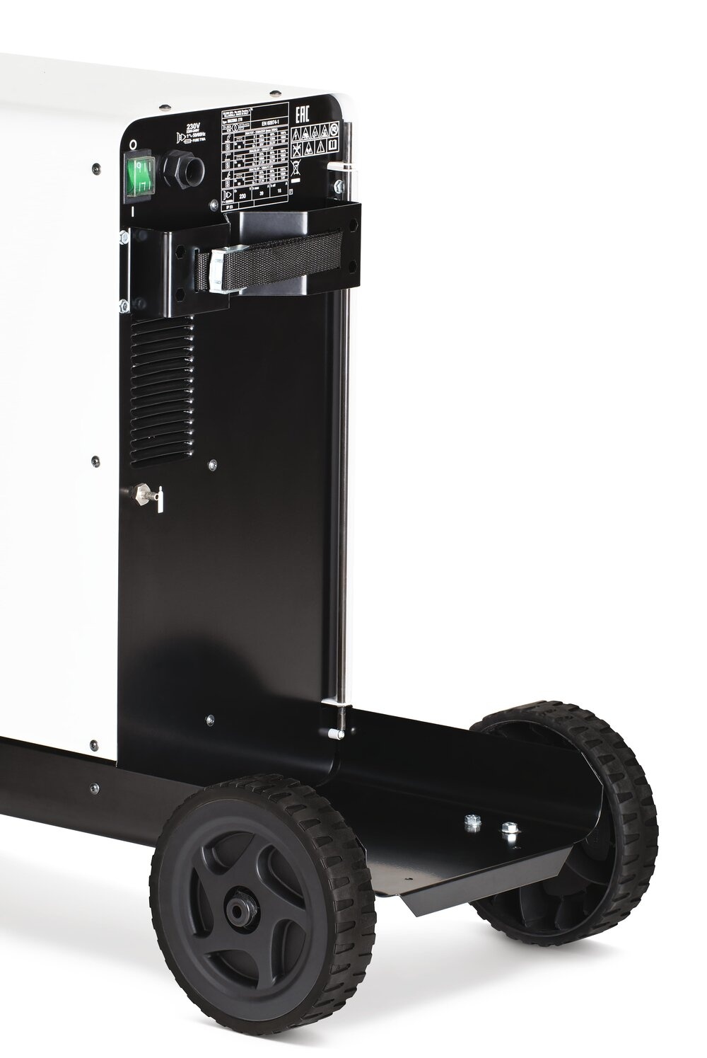 De Telwin Maxima 230 Synergic wordt geleverd inclusief wielen, stevig onderstel en metaalplaat om een gasfles mee te vervoeren.