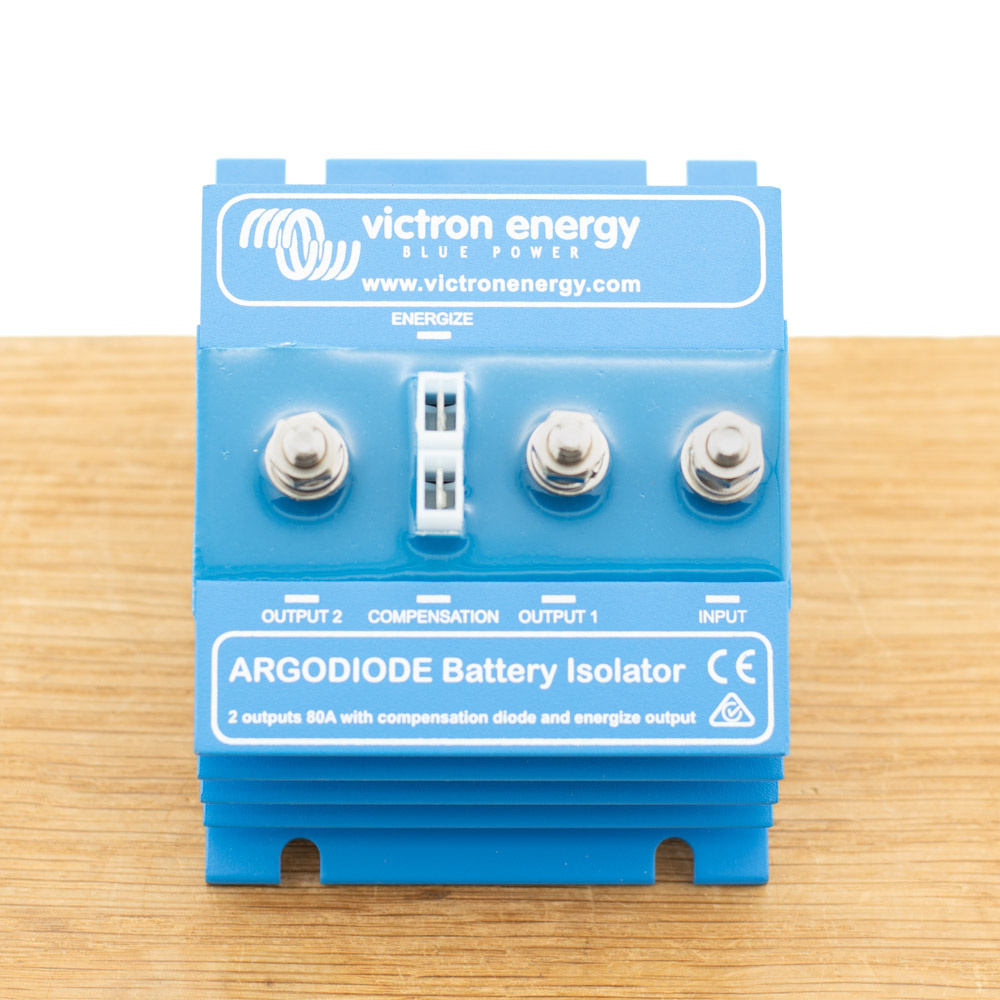 De Victron Argodiode 80-2AC 80A Battery Isolator is een laadstroomverdeler, bedoeld om 2 accu's gelijktijdig te laden met één dynamo. Tijdens het ontladen (gebruiken) van de accu's worden de accusets van elkaar gescheiden door de diodes. Als bijvoorbeeld de accessoire accu ontladen/ gebruikt wordt dan zal de startaccu volledig geladen blijven.