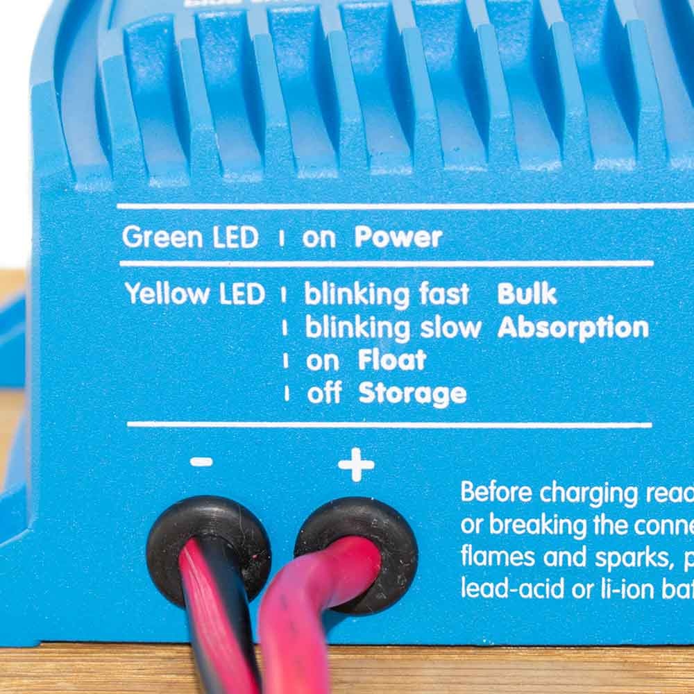 Twee leds op de lader tonen statusindicatie van de lader. Uitleg bij de leds: Gele LED: bulklading (snel knipperend), absorptielading (langzaam knipperend), druppellading (brandt permanent), opslaglading (uit) Groene LED: lader is aangesloten aan het 220V stroomnet