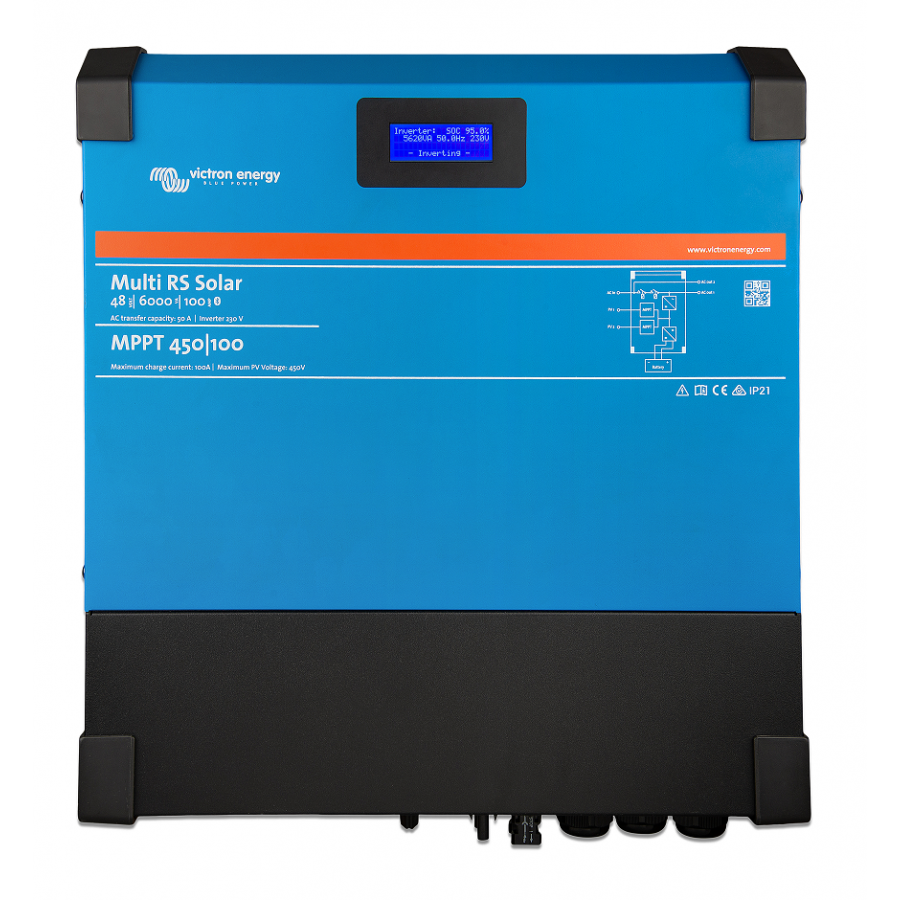 De Victron Multi RS Solar 48/6000/100-450/100 is een 48V 6 kVA inverter met 450 VDC 4 kWp PV-input. De Multi RS Solar is een combinatie van een krachtige omvormer, een bi-directionale DC-DC converter en een MPPT laadregelaar. De Victron Multi RS Solar biedt een uitstekend rendement, een laag stand-by-vermogen en een zeer stille werking.
