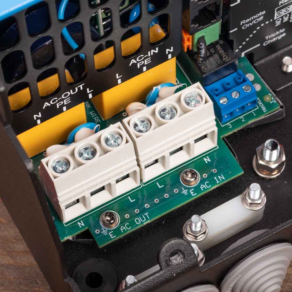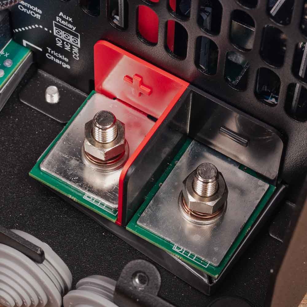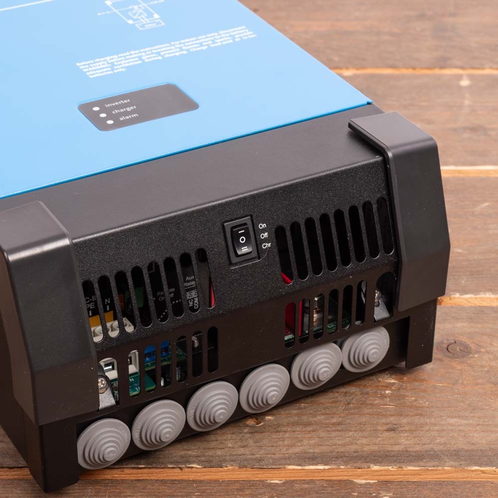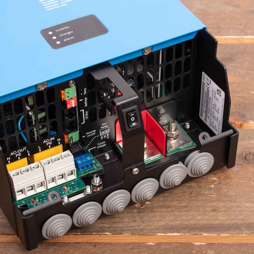 De Victron MultiPlus wordt geleverd zonder de benodigde kabels. U kunt hiervoor 10 mm² kabels gebruiken (25 mm² rode accukabel/ laskabel en 25 mm² zwarte accukabel/ laskabel) bij een afstand tot de accu van maximaal 5 meter. Bij langere afstand tot de accu dan 5 meter wordt geadviseerd 16 mm² kabels te gebruiken. Bekabeling kunt u ook vinden via de links onderaan de tekst bij dit product. De stekkers voor de in- en uitgang op de Multiplus voor 230V worden wel meegeleverd.