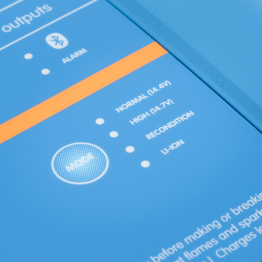 Het laadalgoritme kan worden ingesteld met behulp van Bluetooth en de Victron app of de VE.Direct interface. Met de modusknop kunnen drie voorgeprogrammeerde laadalgoritmes worden gekozen.