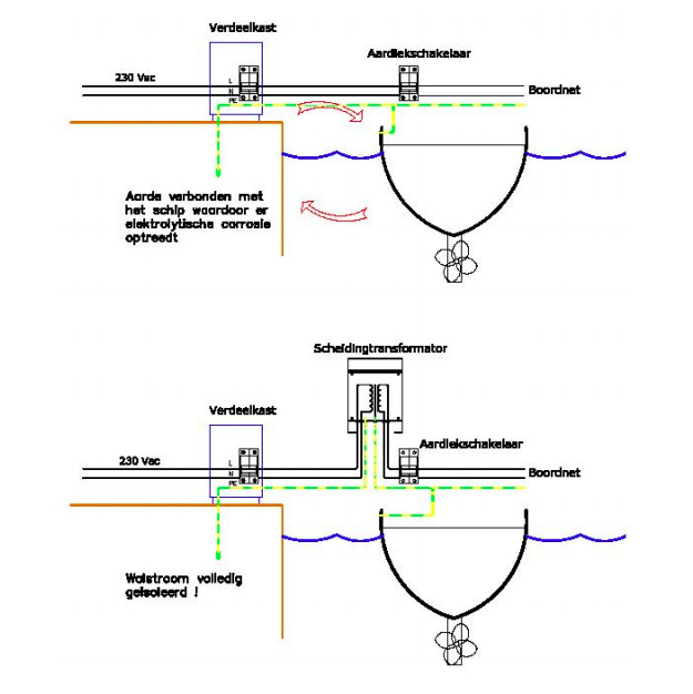 De nulleiding van de secundaire zijde van de transformator is verbonden met de behuizing en de massa van het schip (alle metalen delen). Bij een eventuele elektrische storing zal een aardlekschakelaar of een zekering in werking treden. Foto 4 geeft in een afbeelding schematisch het verschil aan tussen een situatie zonder scheidingstransformator en met scheidingstransformator bij aansluiten van uw schip aan de walstroom.