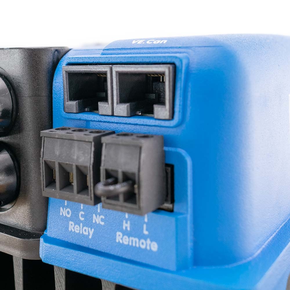 Deze MPPT laadregelaar is uitgerust met zowel VE.Direct als met VE.Can. Met VE.Can of Bluetooth kunnen tot 25 zonneladers in serie gezet worden, en verbonden worden met een Color Control GX of ander GX-toestel. Elke Regelaar kan individueel beheerd worden, bijvoorbeeld met een smartphone of iPad (Bluetooth) of met een Color Control GX (VE.Can) en dan eventueel ook op de VRM-website.