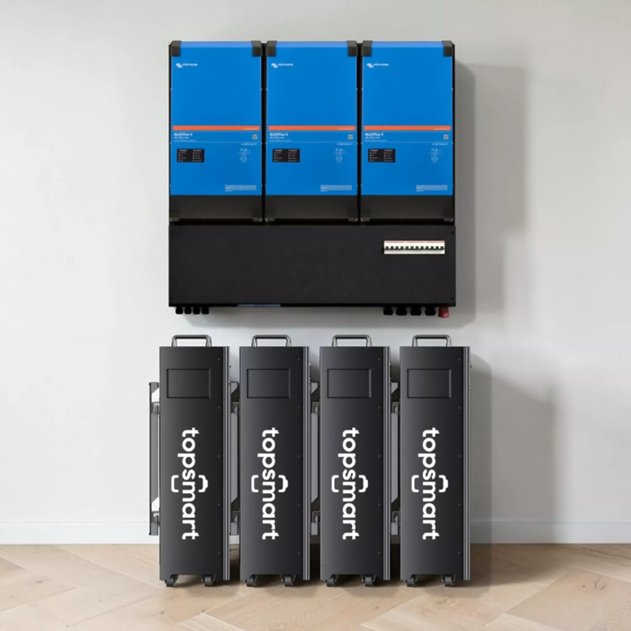 TopSmart ESS is een complete, zelfs kant en klare thuisbatterijoplossing. Het slimme, volautomatische energiesysteem is modulair opgebouwd, met Victron componenten. De aansluiting is grotendeels slechts een kwestie van inpluggen.