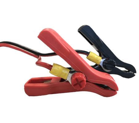 De aansluiting op de accu gebeurt met een 1 meter lange laadkabel met M6 ringogen of accuklemmen/ krokodillenbekklemmen. De accuklemmen kunnen gemakkelijk en snel gemonteerd worden op de ringogen.